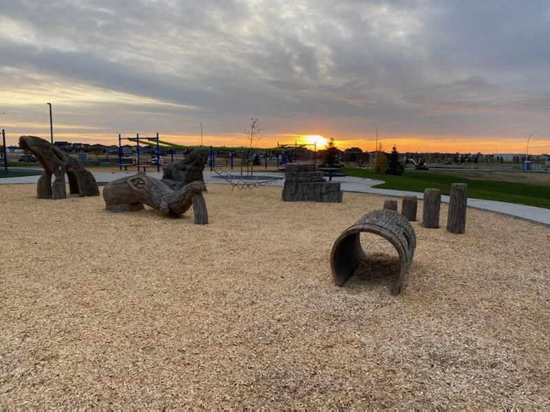 The playground sits on the north portion of a future elementary school site. At this time, no funding has been approved by the Government of Alberta for design or construction of the school.